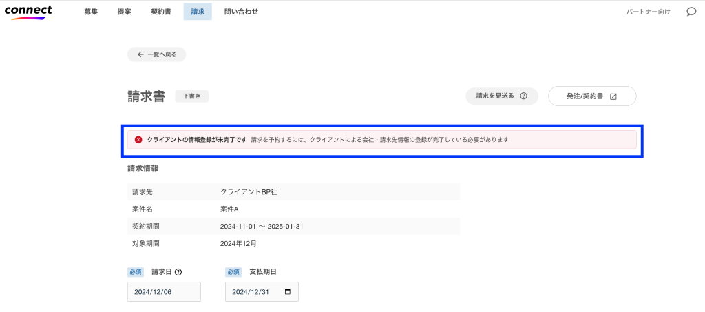 請求書を作成のタイミングで、稀に以下青枠の帯が表示されるケースがございます。