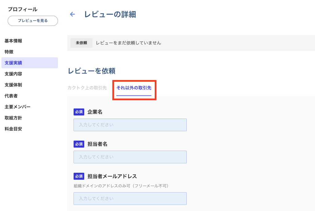 お試しいただいてクライアント様が受信できない場合は、別アドレスでレビュー依頼を行ってください。(別アドレスの場合は、「それ以外の取引先」をクリックしていただき必須項目を入力し依頼を行ってください)