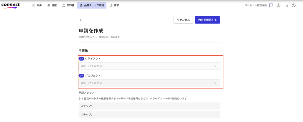 契約書の締結をしていただくと品質チェック申請の提出が可能となります。