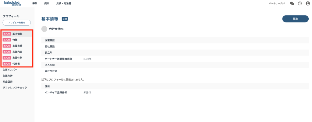 「基本情報」〜「代表者」の未入力ラベルが貼ってある箇所を全て入力するとエントリーが可能となります。