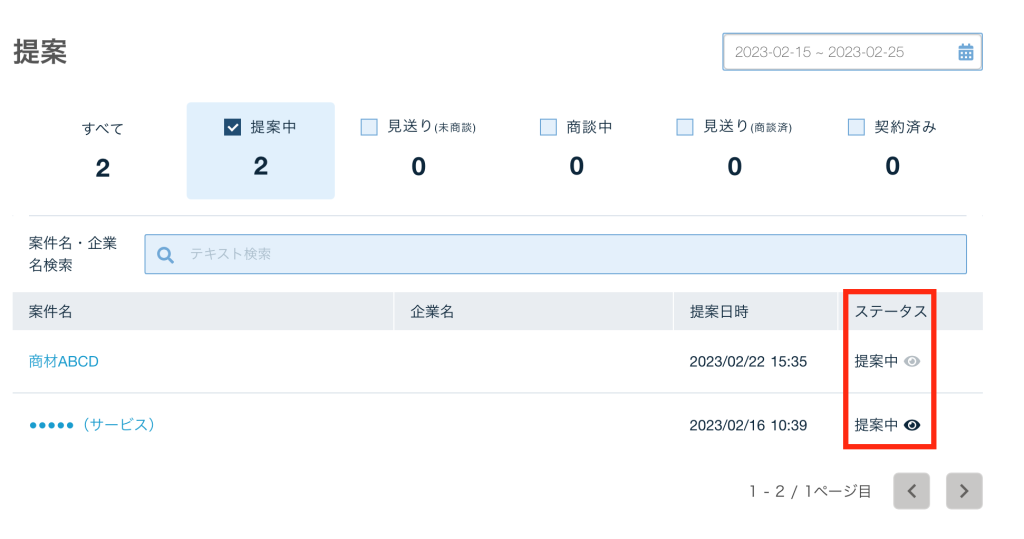 提案一覧のステータス横にある目玉マークにつきましては、クライアントがパートナーの提案を閲覧したか否かを表示しております。 ・黒→閲覧した・グレー→閲覧していない ※目玉のマークにつきましてはステータスが「提案中」のみ表示されます。