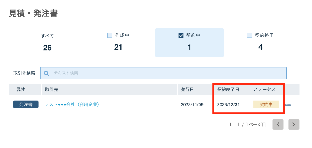 見積・発注書の「契約終了日」が経過すると、契約中→契約終了へ自動的に変更されますので特に対応の必要はございません。
