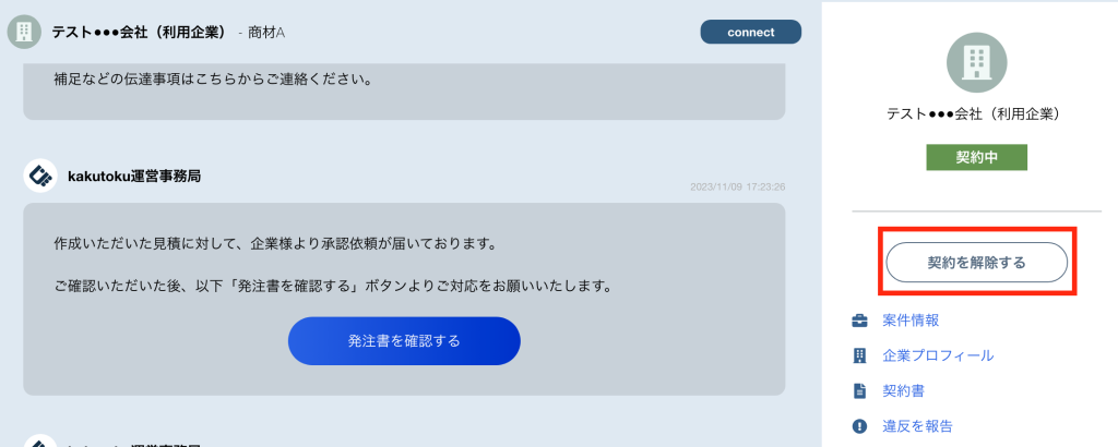 手順2:メッセージ画面(【お客様とのやり取り】のURL)の右側に「契約を解除する」ボタンがございますので、そちらをクリックしていただき契約停止申請を行ってください。
