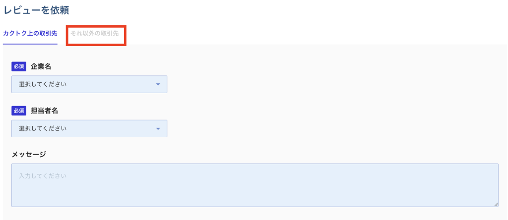 レビューを依頼したい方が、評価者氏名の箇所に表示されない場合は、添付画像右側「それ以外の取引先」のタブを押して評価を依頼してください。