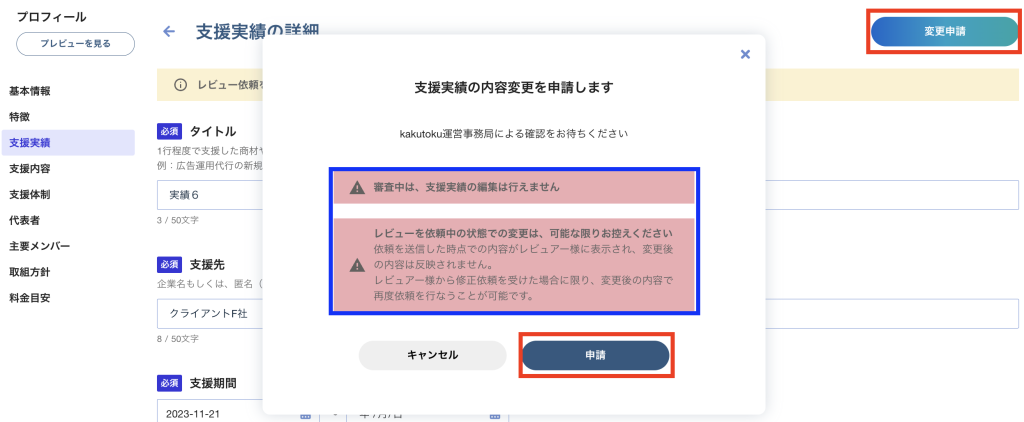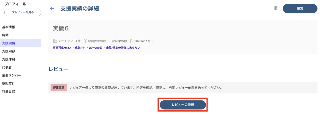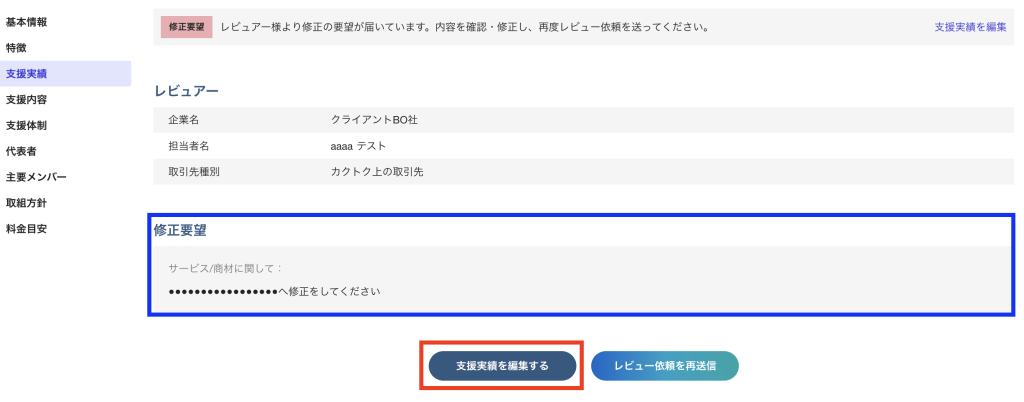 ②青枠がレビュアーの修正要望箇所となるため、「支援実績を編集する」ボタンを押して修正する