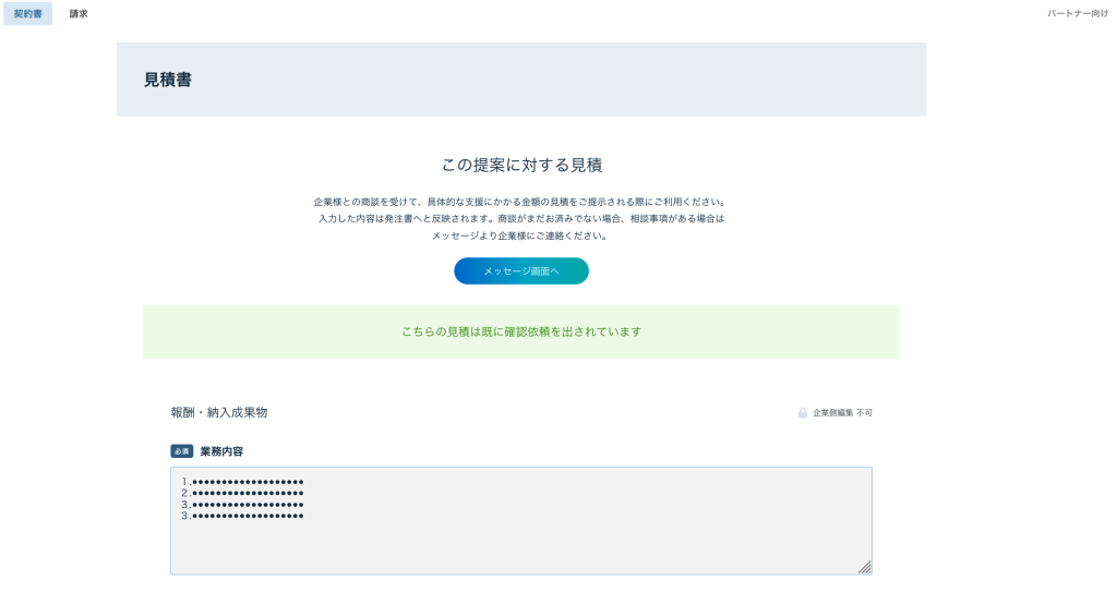 パートナー様にて編集不可の場合(下記画像):クライアント様にてストップしている状態となります。クライアント様へご連絡いただき、締結を進めてください。