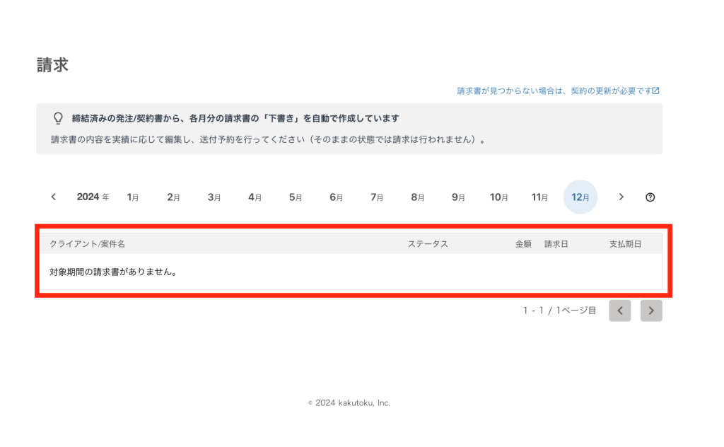 システム仕様上、赤枠箇所に請求書が反映するタイミングが夜中のタイミングとなります。