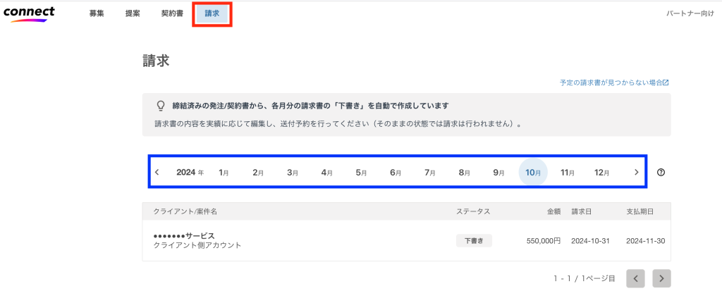 赤枠の請求タブを開き、青枠の請求を行う予定の「月」を選択する。