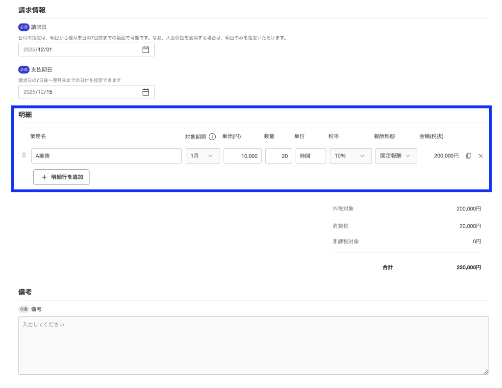 追加で発生した業務や、経費などもございます場合は、「明細行を追加」ボタンをクリックしていただき明細の行を追加してください。