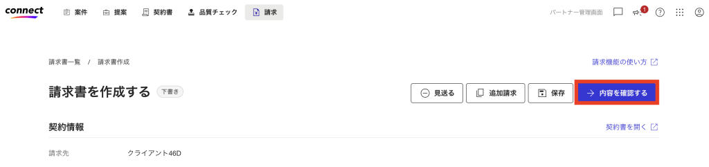 請求書の内容が表示されるため確認いただき、問題なければ以下画像の赤枠「内容を確認する」をクリックしてください。