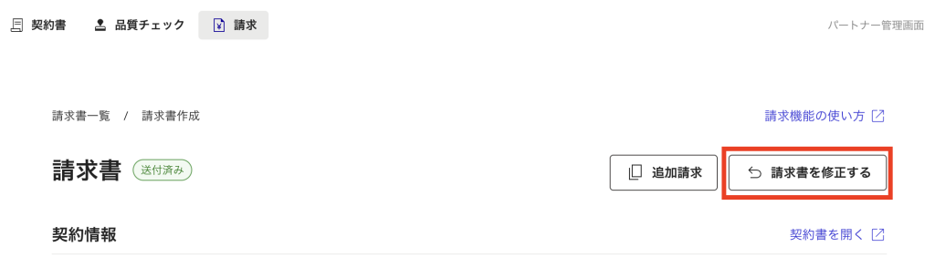 該当の請求書を開き、画面内の赤枠にある「請求書を修正する」ボタンをクリックしてください。