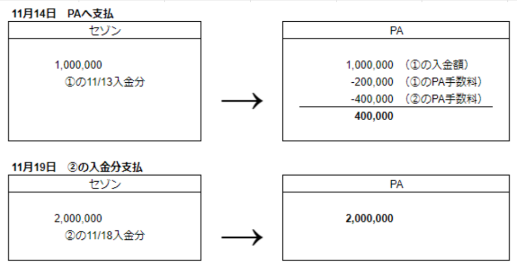 クレディセゾンより20万円(①請求額100×20%)、40万円(②請求額200万円×20%)の合計60万円が①入金額100万円から控除される