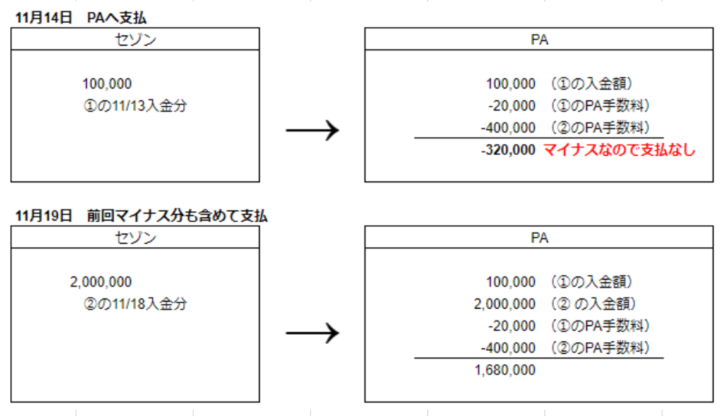 2件の手数料額は2万円(①請求額10×20%)、40万円(②請求額200万円×20%)の合計42万円となり、①入金額10万円から控除するとマイナスとなるため、Xパートナーへの支払いは発生しない