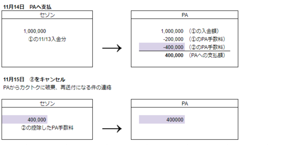 クライアントからの入金が①は11月13日に発生し、②については11月15日に請求不備からキャンセルした場合